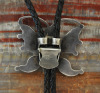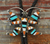This is a vintage Zuni bolo tie from the 1960s. It has inlay done in the old style (fitted together, not channeled), handmade silver drops, and twisted wire antennae. The hallmark on the back reads “J Dan Ray.” The clasp is stamped “Bennett Pat. Pend.” It has a black braided leather cord with silver tips and measures 18″ hanging. The bolo tie is the official state tie of New Mexico and is perfect for any occasion—both formal and casual.