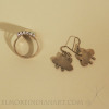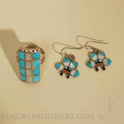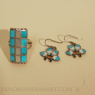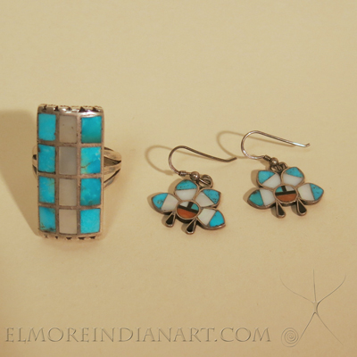 The earrings on the right are classic Zuni inlay with turquoise, shell, and jet. The design depicts the sun kachina, Tawa. The earrings are not hallmarked and date to the 1930s. Each earring measures 1″ width.