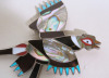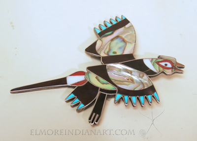 This superb vintage Zuni inlay pin dates to about the 1950s.The pheasant design has excellent movement, depicting the bird taking off in flight. The pin has excellent craftsmanship, with inlaid turquoise, mother-of-pearl, shell, and jet. The pin does not have a hallmark, and measures 2 7/8″ height and 3 5/8″ width.