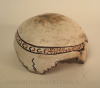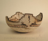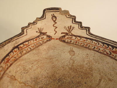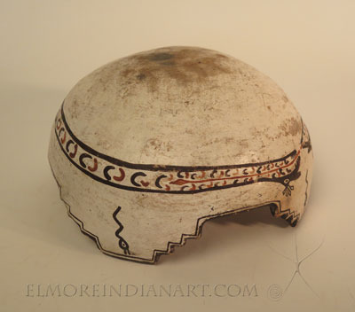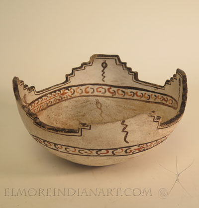 An exceptional example of 19th century Zuni pottery, this stepped bowl features spiritual imagery including feathered serpents with heart lines on the interior and exterior of the bowl. The kiva stepping is accented with tadpole motifs. This bowl measures 11 1/4″ in diameter by 5 3/4″ deep. It is traditionally fired and shows ethnographic wear from use. This piece has some chipping and one of the steps is missing. Overall, it is in very good condition considering its age. An exceptional piece of pottery and a great addition to any collection.
