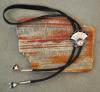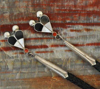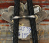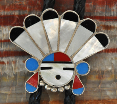 This is a Zuni bolo tie featuring a Sun Face or Tawa with channel inlay. It has a handmade clasp and matching tips with inlay pendants hanging off of them. The tie has a braided leather cord with a nice neck strap. It is in good condition and measures 19″ hanging. The bolo tie is the state tie of New Mexico—and a vintage one like this is perfect for any occasion, formal or casual.