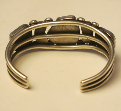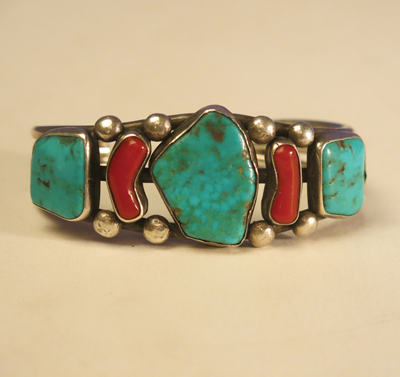 This classic silver bracelet is an excellent example of Zuni craftsmanship dating from around 1930 to 1940. It is typical of work collected by trader C.G. Wallace, featuring large untreated turquoise stones and fine pieces of coral attached to a sturdy triple-shank band with silver raindrops. Measures 5 ½” around the inside with an added 1 ¼” opening for the wrist. A great piece of southwest history.